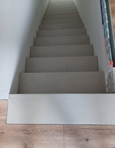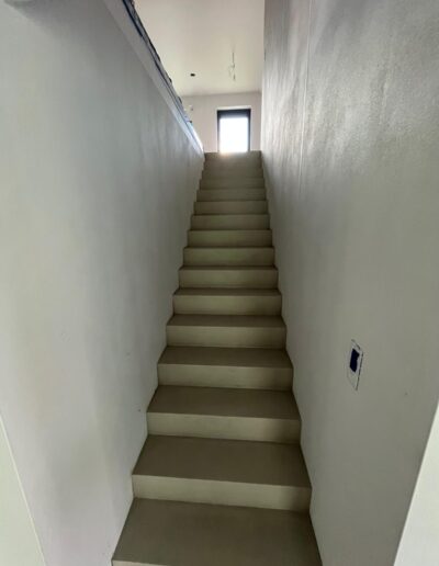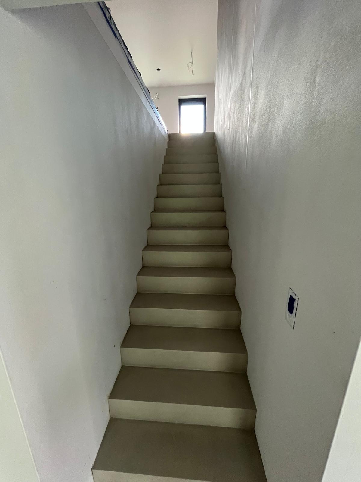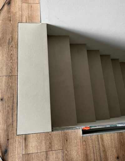 Zajęliśmy się transformacją schodów. Dzięki reprofilacji i pokryciu ich mikrocementem w ciepłym kolorze Warm Cement, stare stopnie zyskały nowoczesny i monolityczny charakter.